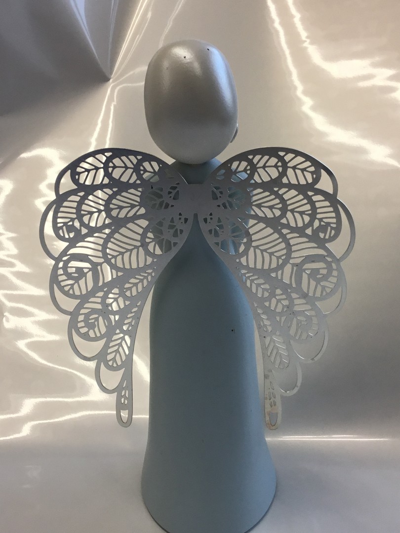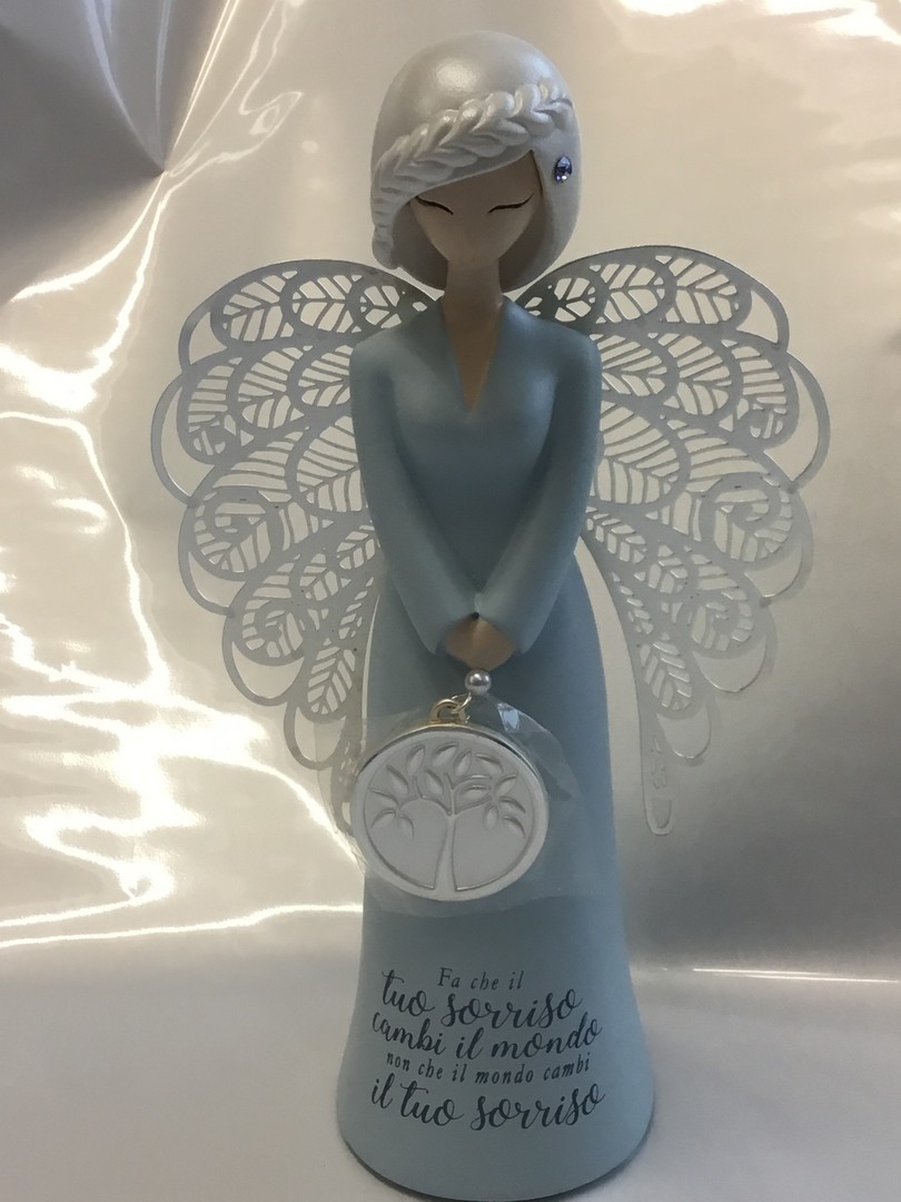 ali in metallo argento, in mano una medaglietta che raffigura l’albero della Vita