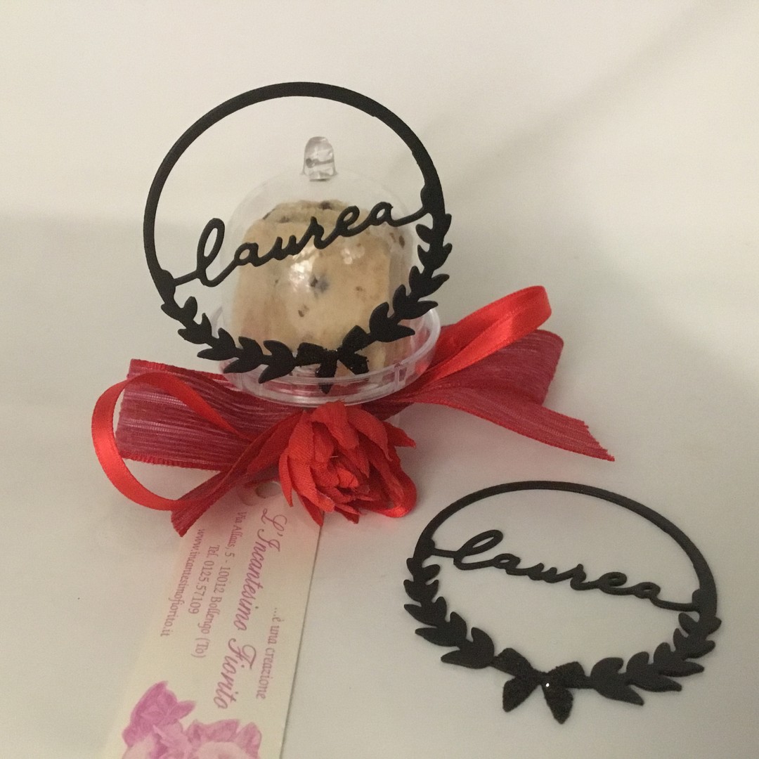 fiocco davanti con tre confetti rossi e cerchio in metallo con la scritta Laurea