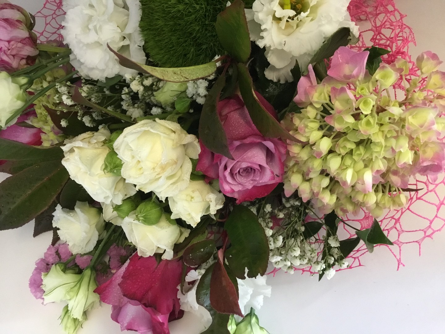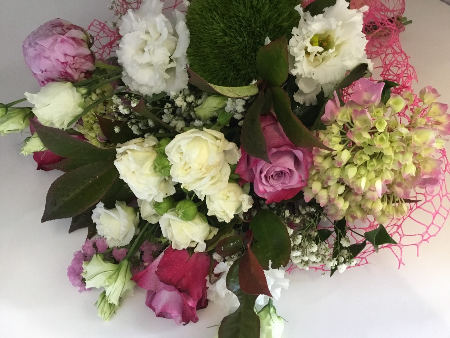Spiccano ortensie, lisiantus, rose , diantus, gipsofila