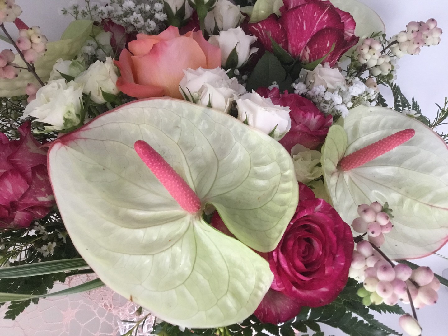 1 Mazzo floreale misto dai tenui color pesca con fiori quali Rose Anthurium e bacche finemente confezionato tono su tono.