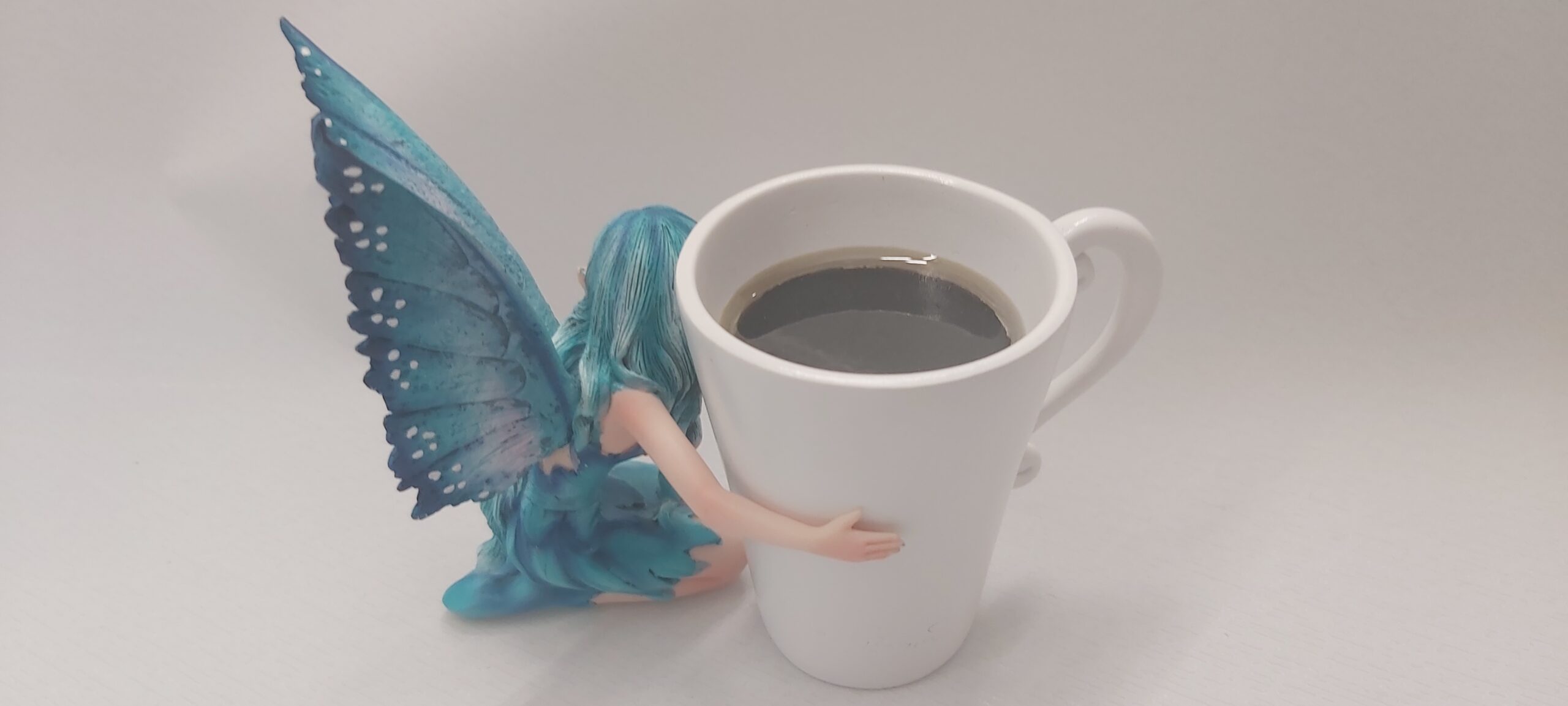 La fatina che abbraccia una tazzina di caffè è realizzata in resina dipinta a mano