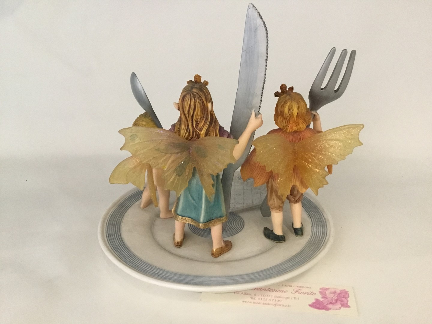 statua meravigliosa da collezione con 3 fate con in mano le posate, loro sono su piatto di 19 cm di diametro