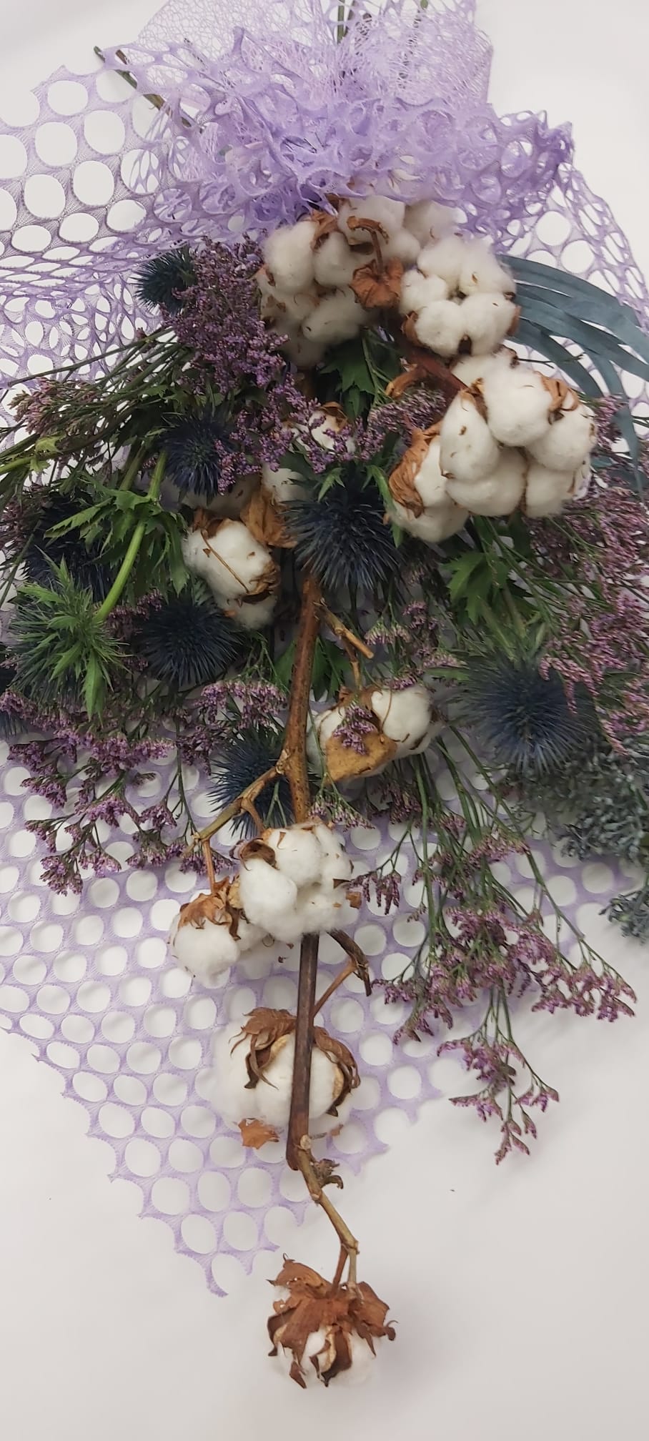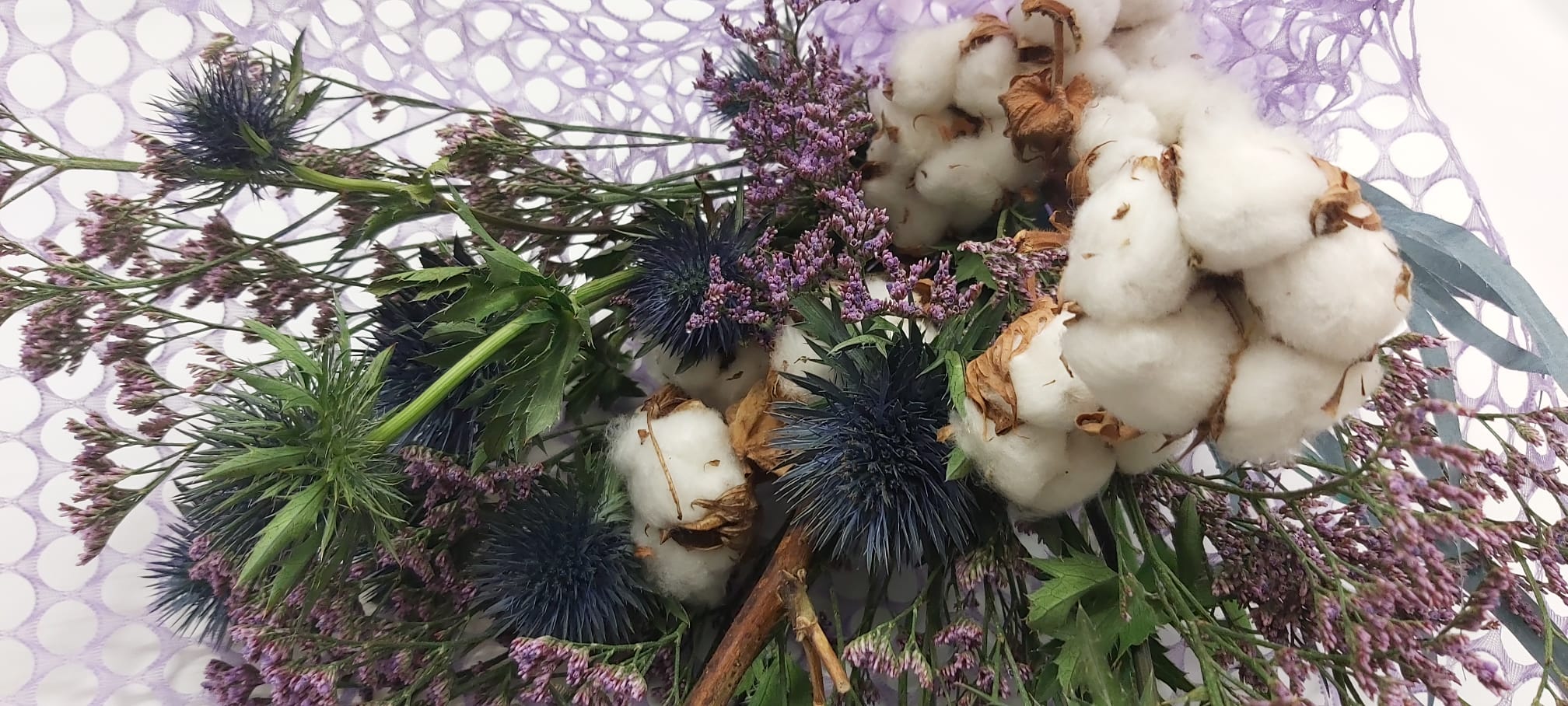 con cotone, limonium ed Eringium blu.