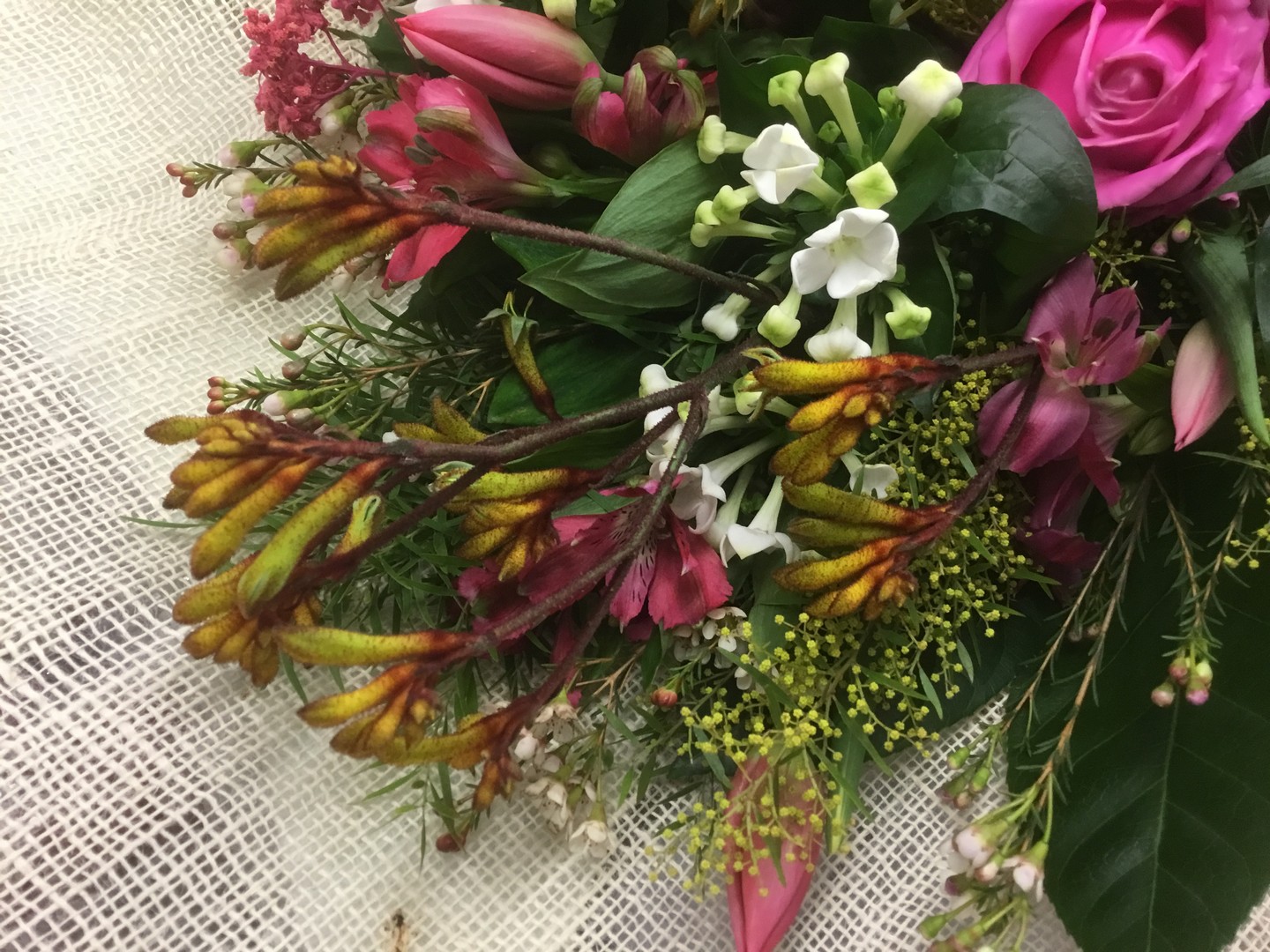 nel misto troviamo tulipani, fiori di cera, alstromeria rosa – fucsia, buvardia bianca, achillea rosa,