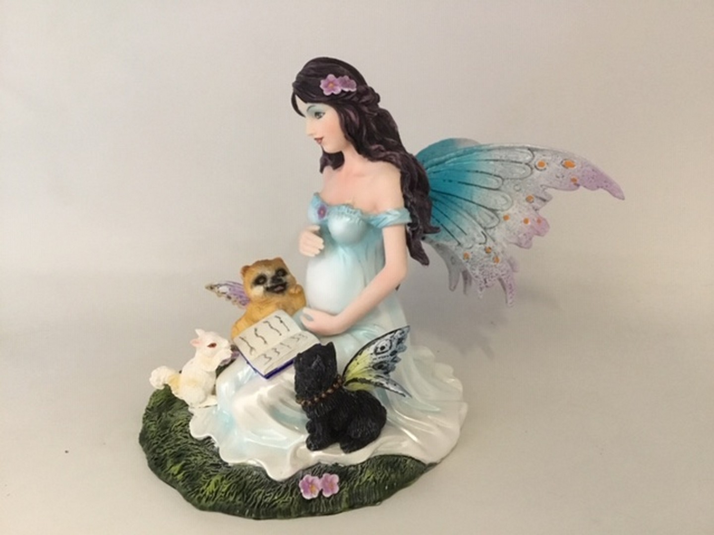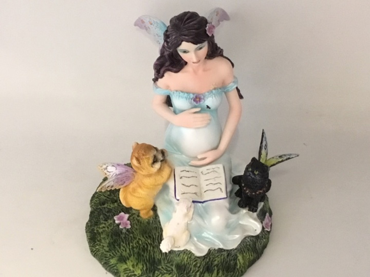 la fantastica fata incinta, inginocchiata con libro aperto
