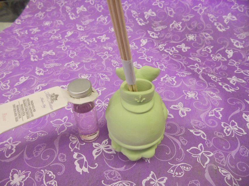 Simpaticamente allegra, la balenottera con cappello di capitano, in gesso completata da fiala profumatore ambiente ricaricabile e bastoncini in legno diffusori.