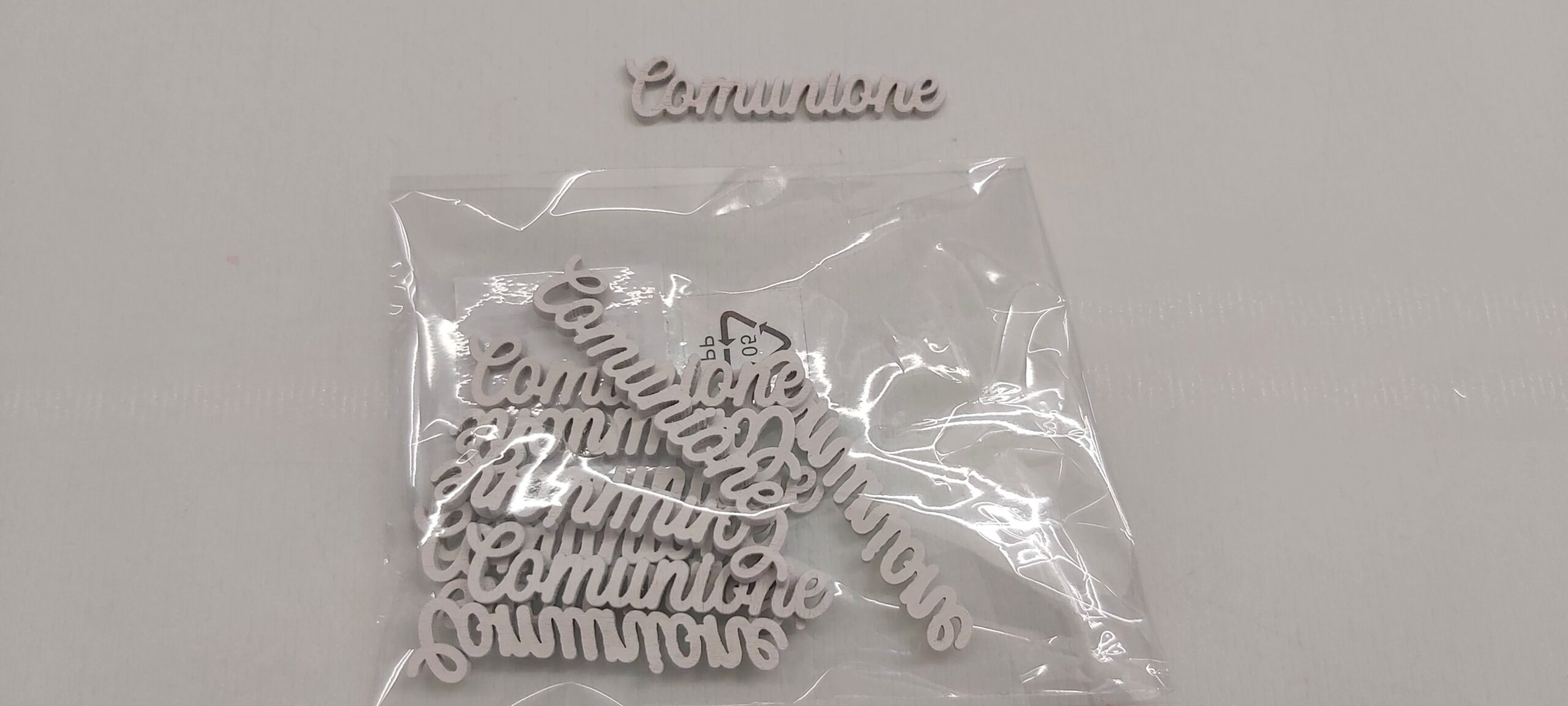 Scritta “Comunione” o “Cresima” realizzata in legno dipinto.