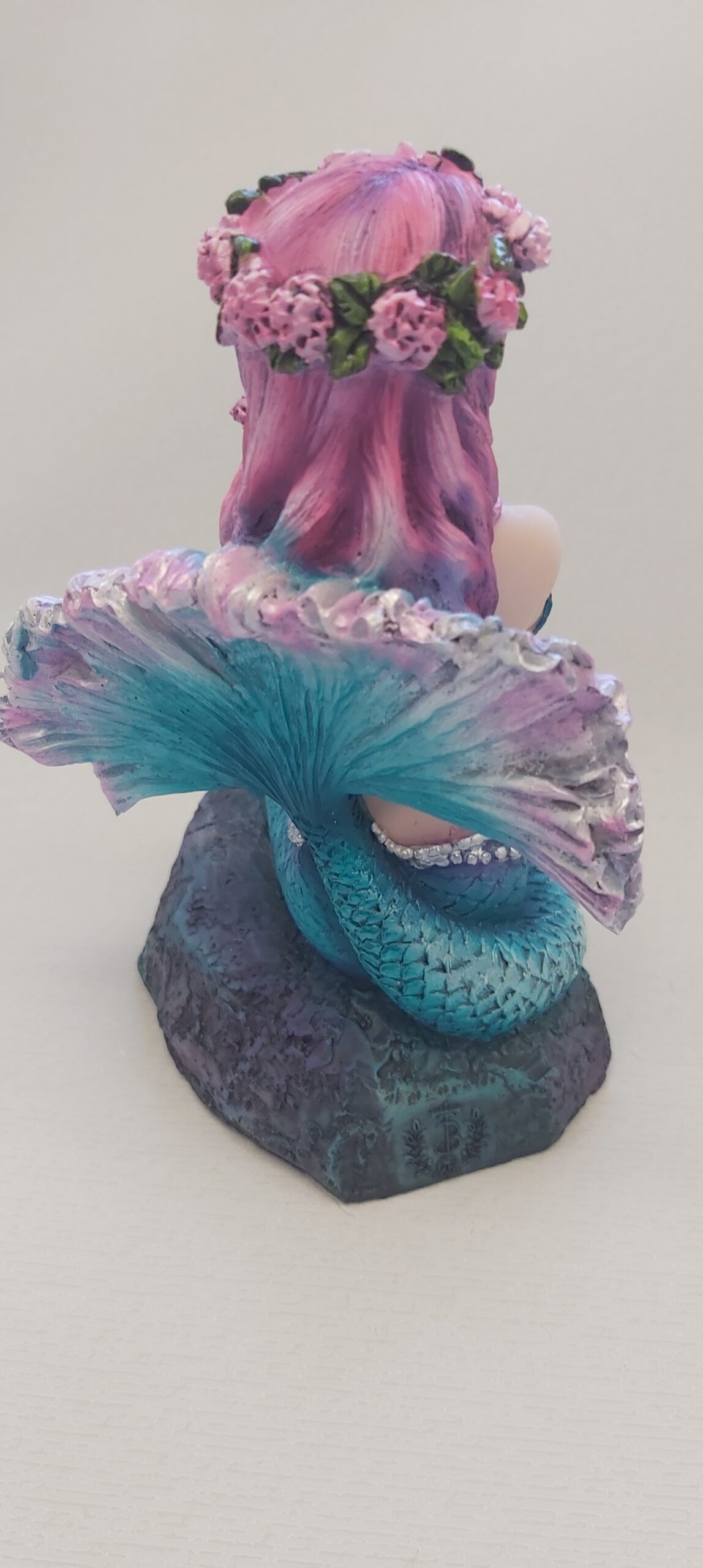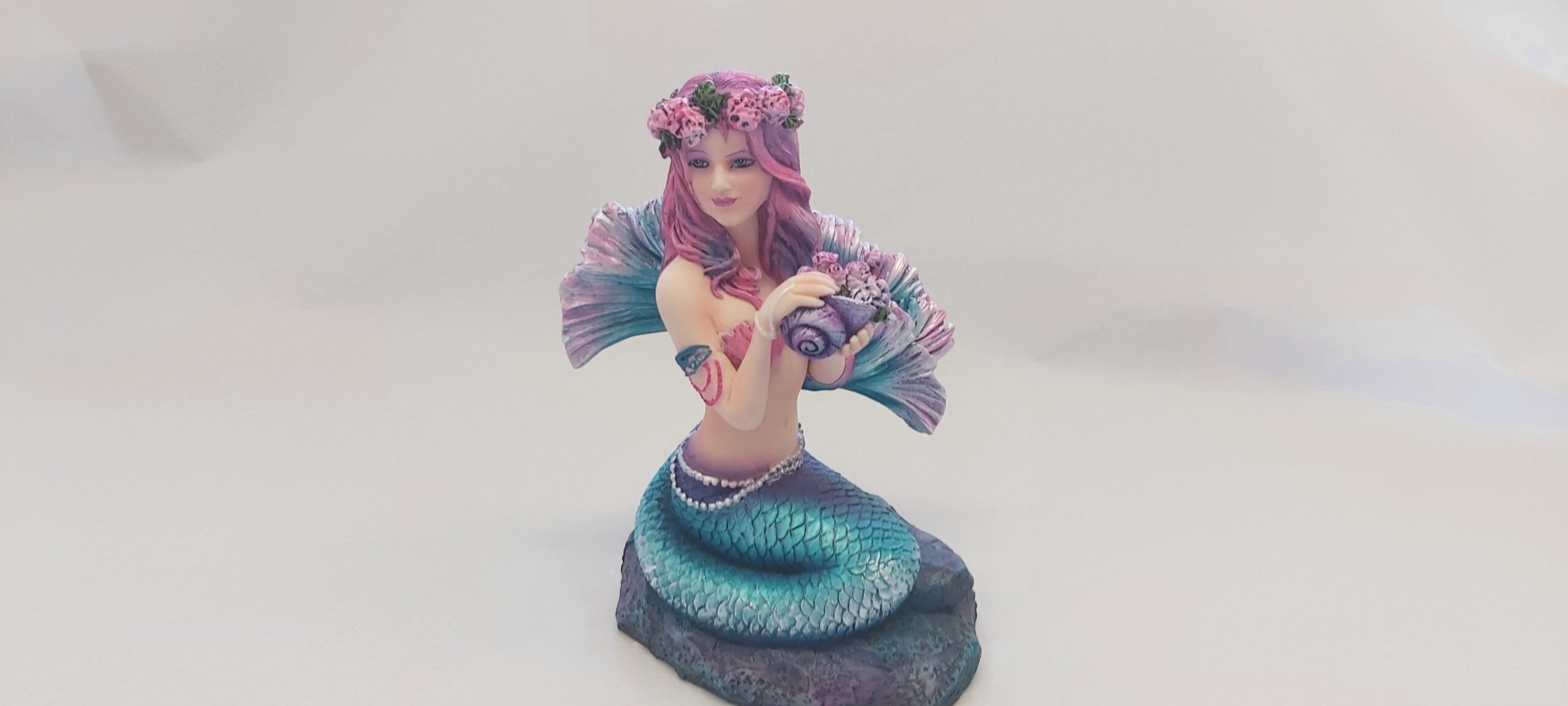 Sirena con conchiglia tra le mani e coroncina di fiori.