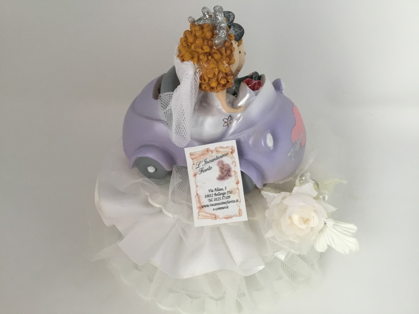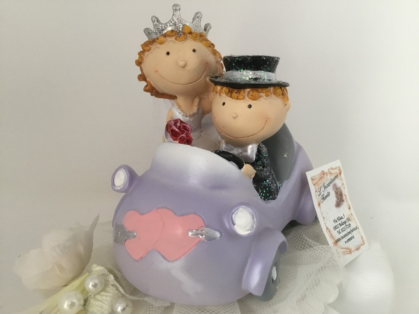 simpatici sposi seduti su macchinina lilla con doppio cuore disegnato sul cofano.