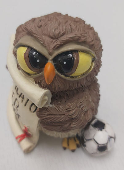 Simpatico e sportivo il gufo che mostra il certificato di Super Calciatore, mentre vicino alla zampa fa bella mostra di se un pallone………….