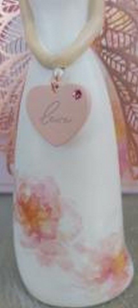 ali metalliche e capelli color rosa con cuore in metallo tra le mani